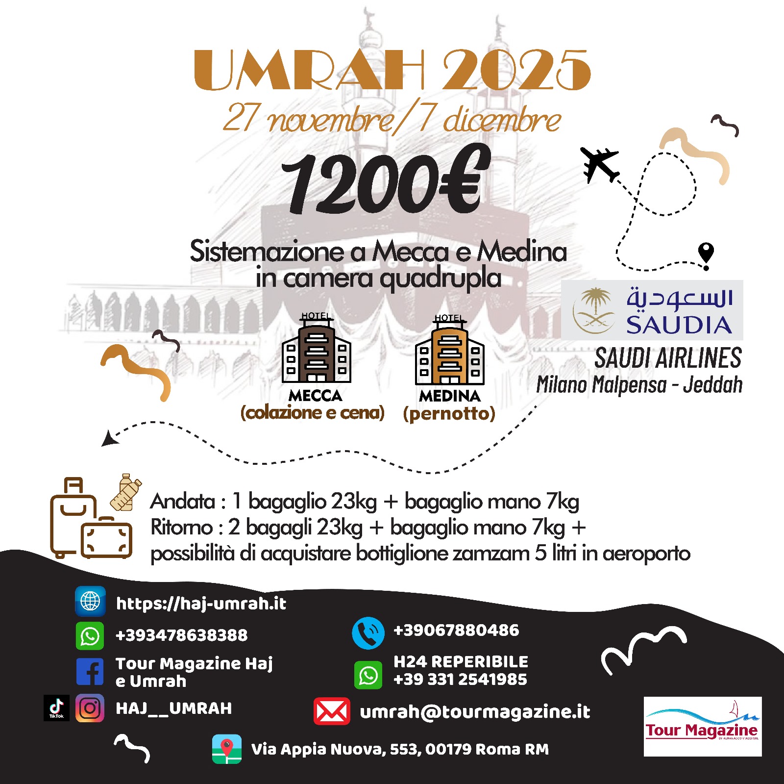 Partenza 27 Novembre con ritorno il 7 Dicembre 2025 da Milano Malpensa Il volo è con la compagnia aerea SAUDI Airlines, partenza da Milano Malpensa con arrivo finale a Jeddah e viceversa (volo diretto).andata: 1 bagaglio da 23 kg + bagaglio a mano ...