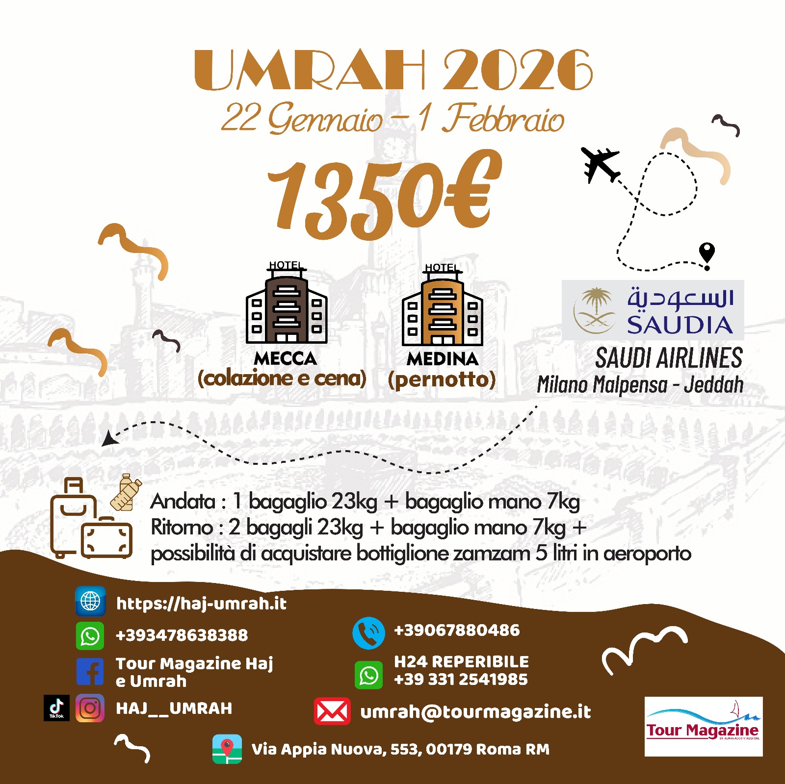 Il volo è con la compagnia aerea SAUDI Airlines, partenza da Milano Malpensa con arrivo finale a Jeddah e viceversa (volo diretto). andata: 1 bagaglio da 23 kg + bagaglio a mano 7 kg + al ritorno: 2 bagagli da 23 kg + bagaglio a mano 7 kg + possibilità di acquistare un bottiglione di acqua Zamzam di 5 litri in aeroporto da spedire come secondo bagaglio
